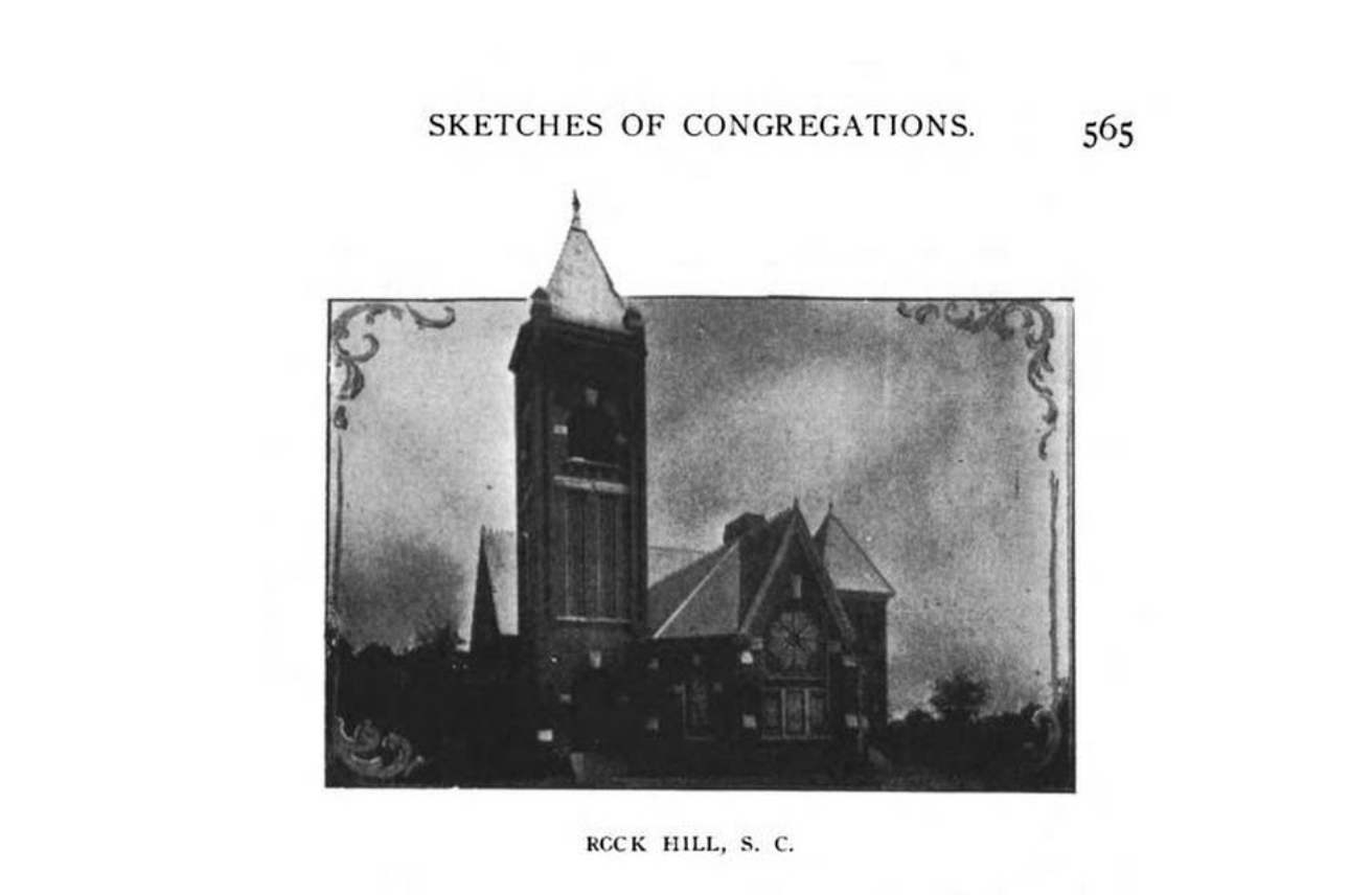 In July, 1895, Mr. A. S. Rogers, then a student in Erskine Seminary, was sent to Rock Hill, S. C., by the Board of Home Missions, to open a mission in that city. He found sixteen members of the A. R. P. Church there, and commenced work. Armory Hall was rented and the first service was held July 7th The attendance and outlook was encouraging from the beginning, and at a meeting of the First Presbytery, held at Clover, S. C., Sept. 30th of the same year, the Presbytery appointed a commission to organize a church there, and also appointed a committee consisting of Revs. Oliver Johnson, C. E. McDonald and Hon. D. E. Finley to co-operate with a committee of the congregation in raising funds and in building a house of worship. On Nov. 19th, 1895, Revs. J. S. Moffatt, J. T. Chalmers and elders Joseph Wylie and Matthew White organized a church of twenty-six members with W. F. Strait, M. D., R. T. Wright and J. M. Lauridge, elders, and L. Black and J. L. White deacons. At the close of the Seminary in June, 1896, Rev. A. S. Rogers, who had completed the course, and been licensed at the spring meeting, was returned to Rock Hill, and appointed to the field for a term of five years. Mr. Rogers canvassed the church for funds to erect a building, and was successful in raising them. The present beautiful and commodious building was begun in 1897, and completed in 1898. The building is of pressed brick, with granite trimmings, and fine architectural effects. It has had a steady and rapid growth, and now has about one hundred and fifty members, and bids fair to become one of our strongest churches. On Dec. 19th, 1901, Rev. A. S. Rogers was installed as pastor, and continues until the present time.